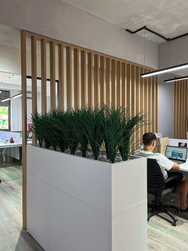 Такой вид озеленения подходит для быстрой перепланировки помещений и разделения функциональных зон: рабочих мест, пространств для отдыха, переговорных, проходов.